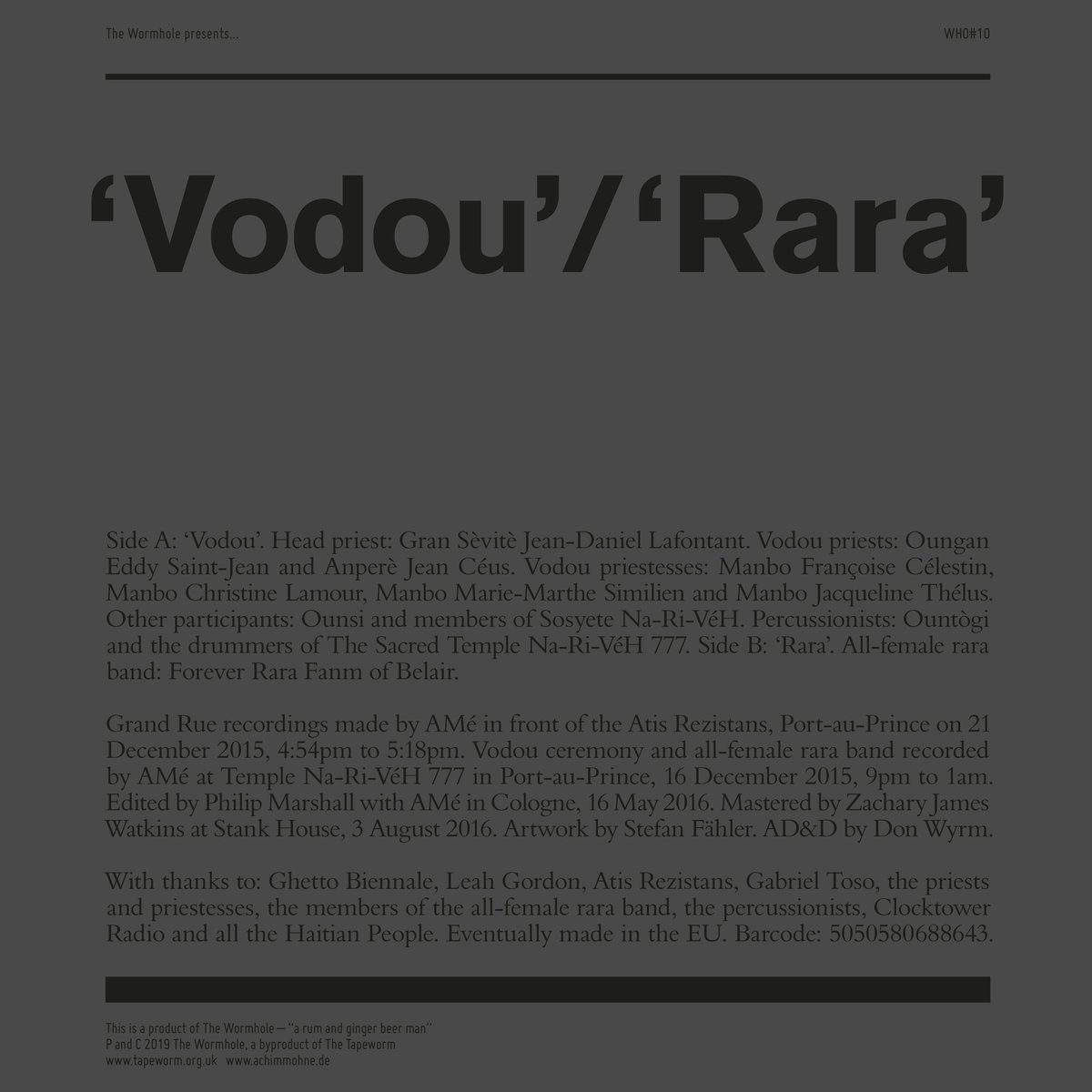 Grand Rue recordings made by AMé in front of the Atis Rezistans, Port-au-Prince on 21 December 2015, 4:54pm to 5:18pm. Vodou ceremony and all-female rara band recorded by AMé at Temple Na-Ri-VéH 777 in Port-au-Prince, 16 December 2015, 9pm to 1am. Edited by Philip Marshall with AMé in Cologne, 16 May 2016. Mastered by Zachary James Watkins at Stank House, 3 August 2016. Artwork by Stefan Fähler. AD&D by Don Wyrm.